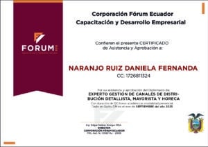 Certificado de asistencia y aprobación como experto en gestión de canales de distribución detallista, mayorista y HORECA emitida por la Corporación Fórum Ecuador.