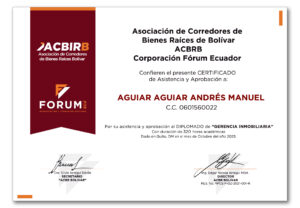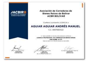 - Licencia Profesional de Corredor de Bienes Raíces emitida por ACBIR Bolívar y regulada por el Ministerio de producción, Comercio Exterior, Inversiones y Pesca. *Válida a nivel nacional