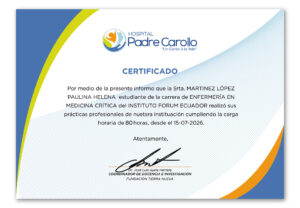 - Certificación de formación de enfermería en medicina crítica con Aval Académico de la Universidad Central del Ecuador.